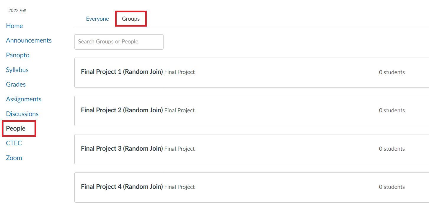 You must join your group on Canvas! Grades are linked to these groups - I will not hunt you down. To get a grade you must be in a group. This is 10% of your grade, you do not want a 0 for the project. On Canvas go to the People tab, and select Final Project Group to add yourself to a group.