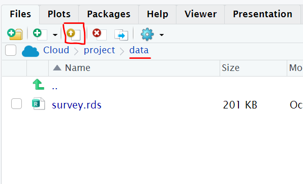 If you choose your own dataset, you will need to upload your data to the Posit Cloud Project. Under the Files Pane, click on the “data” folder, then click the “upload” icon.