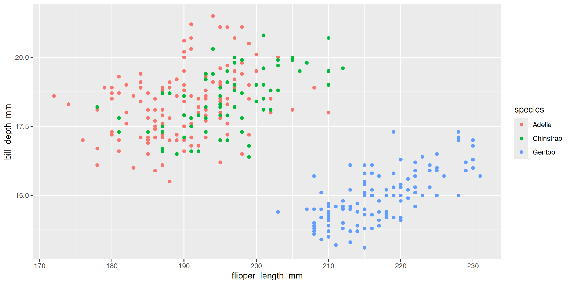ggplot(penguins, aes(x=flipper_length_mm, y=bill_depth_mm, color = species)) +