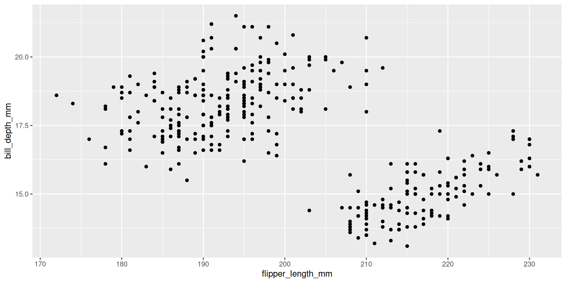 ggplot(penguins, aes(x=flipper_length_mm, y=bill_depth_mm)) +